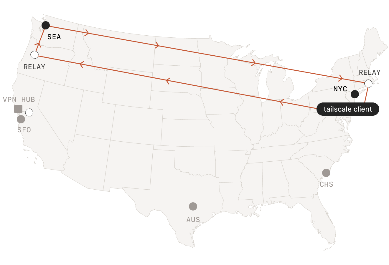 여담으로, 위의 예는 간단한 표현을 위해 미국의 경우를 보여주고 있지만, 실제로 테일스케일은 전세계에 분산 된 릴레이 서버 네트워크를 보유하고 있습니다.