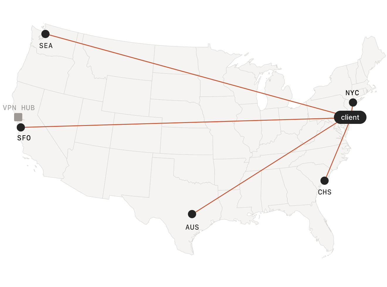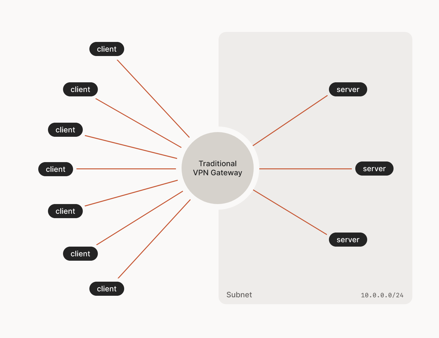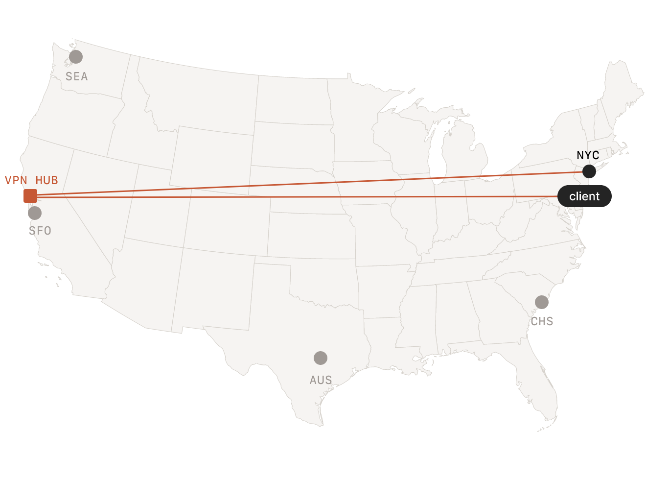 와이어가드 사용자를 포함한 VPN 사용자는 대부분 "허브 앤 스포크"(hub and spoke)아키텍처를 구축하여 각 클라이언트 장치(예를들어, 노트북 컴퓨터)가 중앙 "집선 장치"또는 VPN 게이트웨이에 연결되게 합니다.