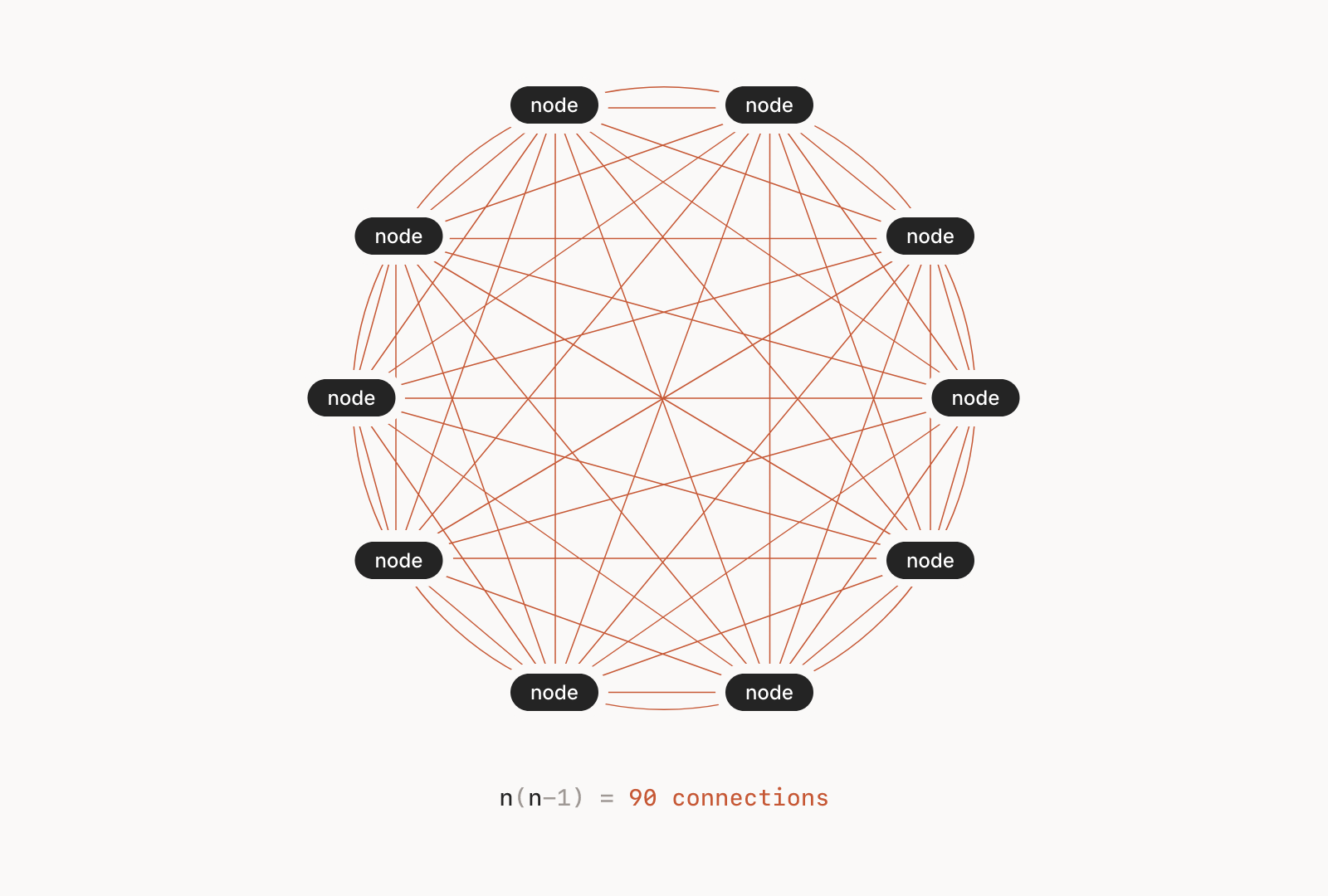 허브 앤 스포크 구조에는 근본적으로 어색한 점이 있는데, 그것은 개별 노드가 서로 대화하지 못하게 한다는 것입니다. 혹시 컴퓨터가 클라우드를 통하지 않고 파일을 직접 교환하던 때를 기억하십니까? 예전에는 인터넷이 모두 이런 방법으로 작동했었습니다. 하지만, 안타깝게도, 현대 인터넷 아키텍처는 거의 우연히 이런 종류의 허브 앤 스포크 디자인으로 발전해 왔기 때문에 개발자들은 피어 투 피어 앱 구축을 중단했습니다.