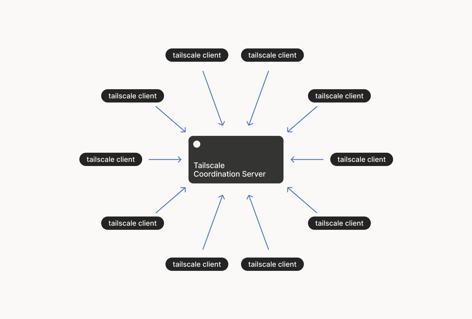 테일스케일은 오픈 소스 Tailscale 노드 소프트웨어를 사용 하여, 공개 키를위한 공유 드롭 박스 인“조정 서버”(login.tailscale.com)와 접촉합니다.