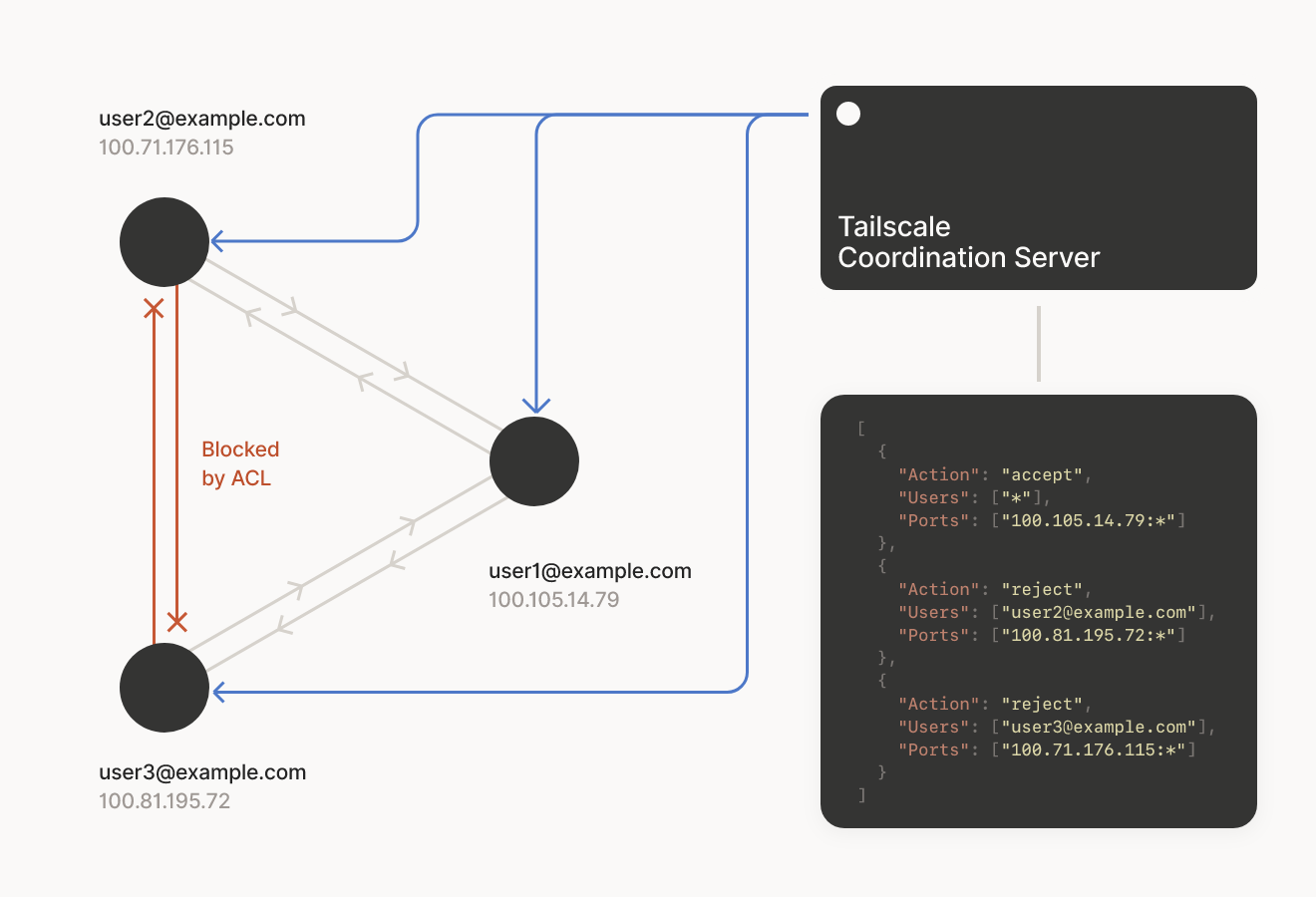 메시 네트워크로 전환하면 문제는 더욱 악화되는 것처럼 보입니다. 중앙 지점이 전혀 없는데 방화벽 규칙을 어디에 배치해야 할까요? 테일스케일의 답은 “모든 단일 노드에”입니다. 각 노드는 암호 해독 시, 허가되지 않은 연결이 들어오는 것을 차단합니다.