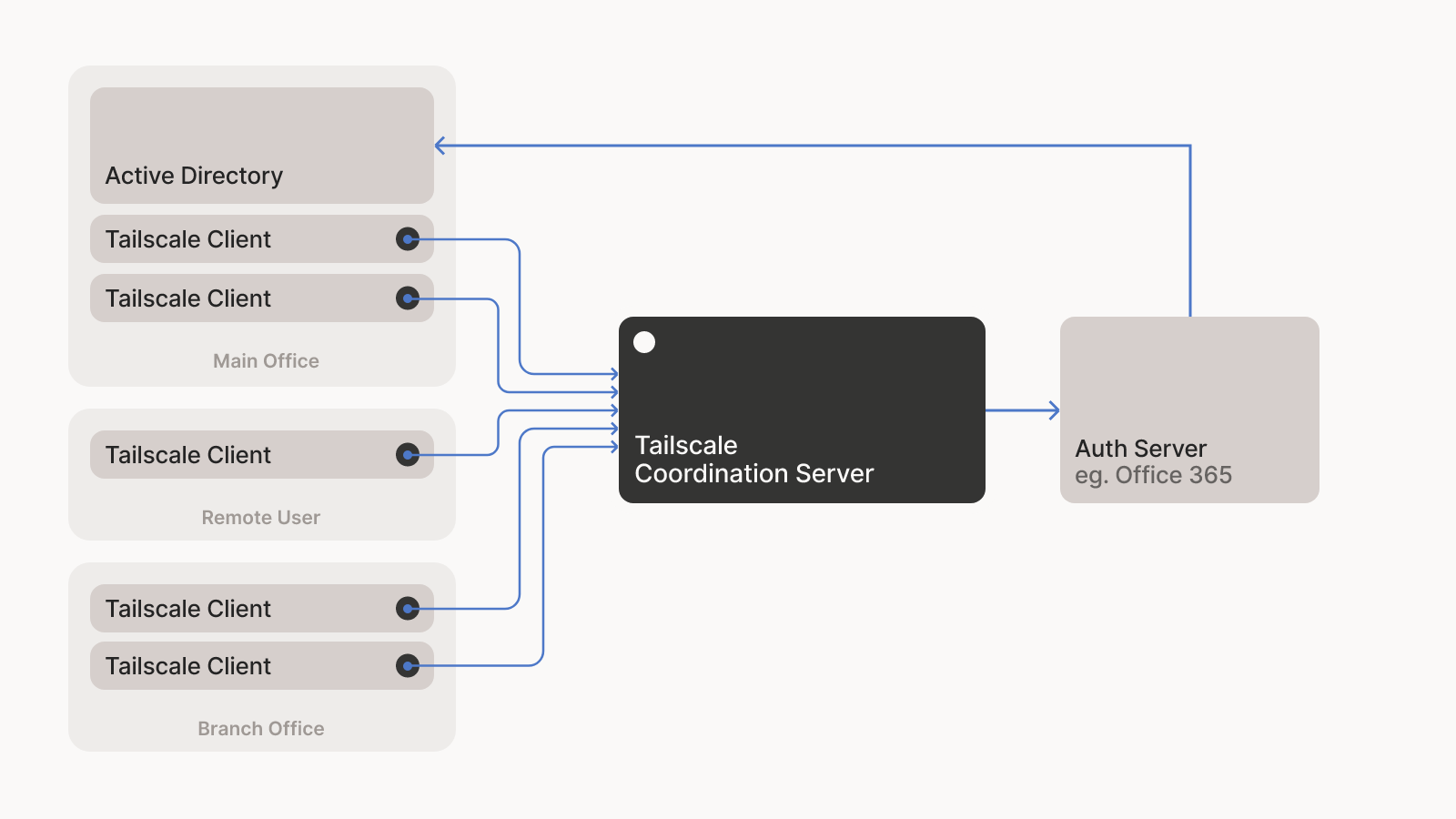 인증 공급자는 도메인의 사용자 목록, 비밀번호, 2FA 설정 등을 유지 관리합니다. 이를 통해 VPN에 대해 별도의 사용자 계정 또는 인증서를 유지할 필요가 없습니다. 사용자는 Google 문서, Office 365 및 기타 웹 앱에 사용하기 위해 이미 설정한 인증을 사용할 수 있습니다. 또한, 모든 개인 사용자 계정 및 로그인 데이터가 다른 서비스에서 호스팅되므로 테일스케일은 사용자의 개인 식별 정보 (PII)를 최소한으로 유지하면서 매우 안정적인 중앙 조정 서비스를 운영 할 수 있습니다. (자세한 내용은 개인 정보 보호 정책을 참고바랍니다.)